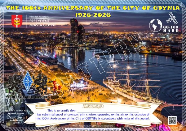 The Board of the Pomeranian Field Division of the Polish Amateur Radio Union (PZK) in GdaĆsk invites all amateur radio operators to participate in a radio award ceremony to celebrate the 100th anniversary of the city of GDYNIA on the AIR | 1926-2026.